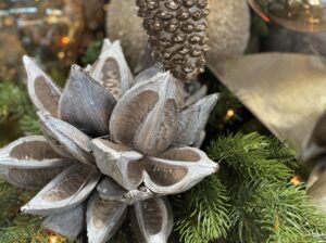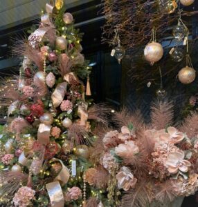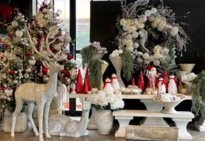 Through the years, we’ve had upside down trees, trees mounted on tables and in sleighs and even a pink tree. This year, BOHOLOVE is the customer favorite. It features Bohemian influences balanced with white-washed vintage urns, baskets and an oversized natural wood Italian mirror as a backdrop.