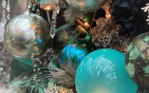 To elevate trees literally and figuratively, our signature style is to present them in containers that are appropriate to the story or theme we’re presenting. Containers may be vintage, wrought-iron, urns, classic or contemporary. This is something you can easily do at home to emphasize the story of your family’s holiday tree.